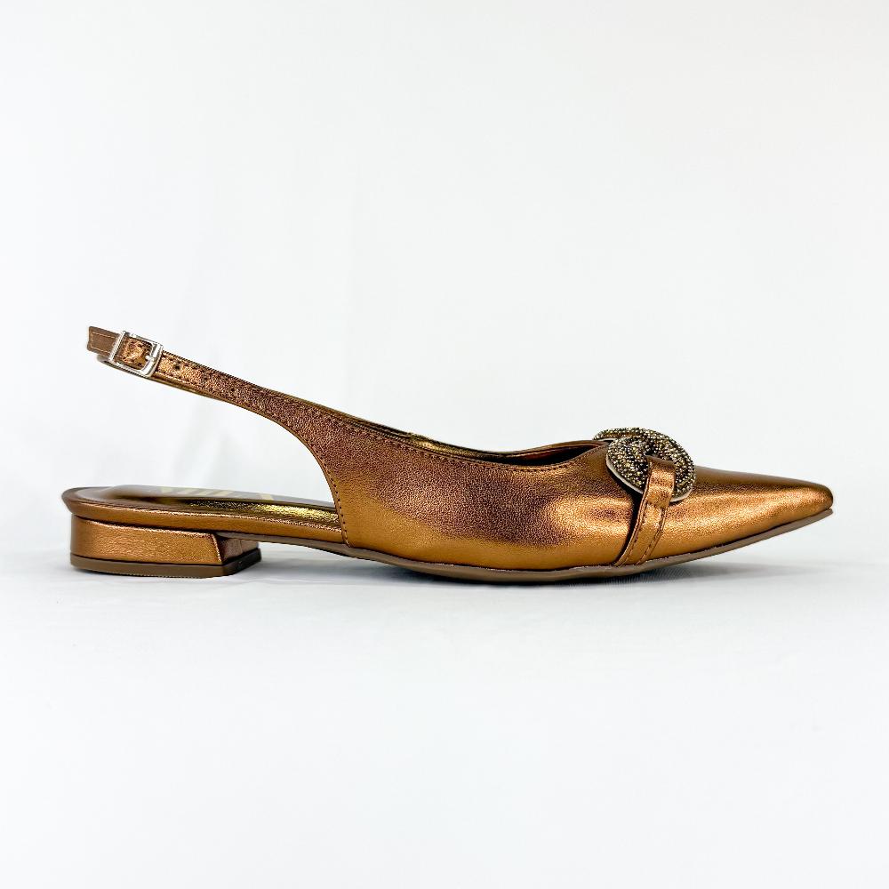 O slingback Catarina é uma peça que combina modernidade e glamour, perfeita para quem busca um estilo sofisticado e único. Na cor bronze, esse slingback apresenta um laço em manta de strass no topo, adicionando um toque de luxo e brilho ao design.