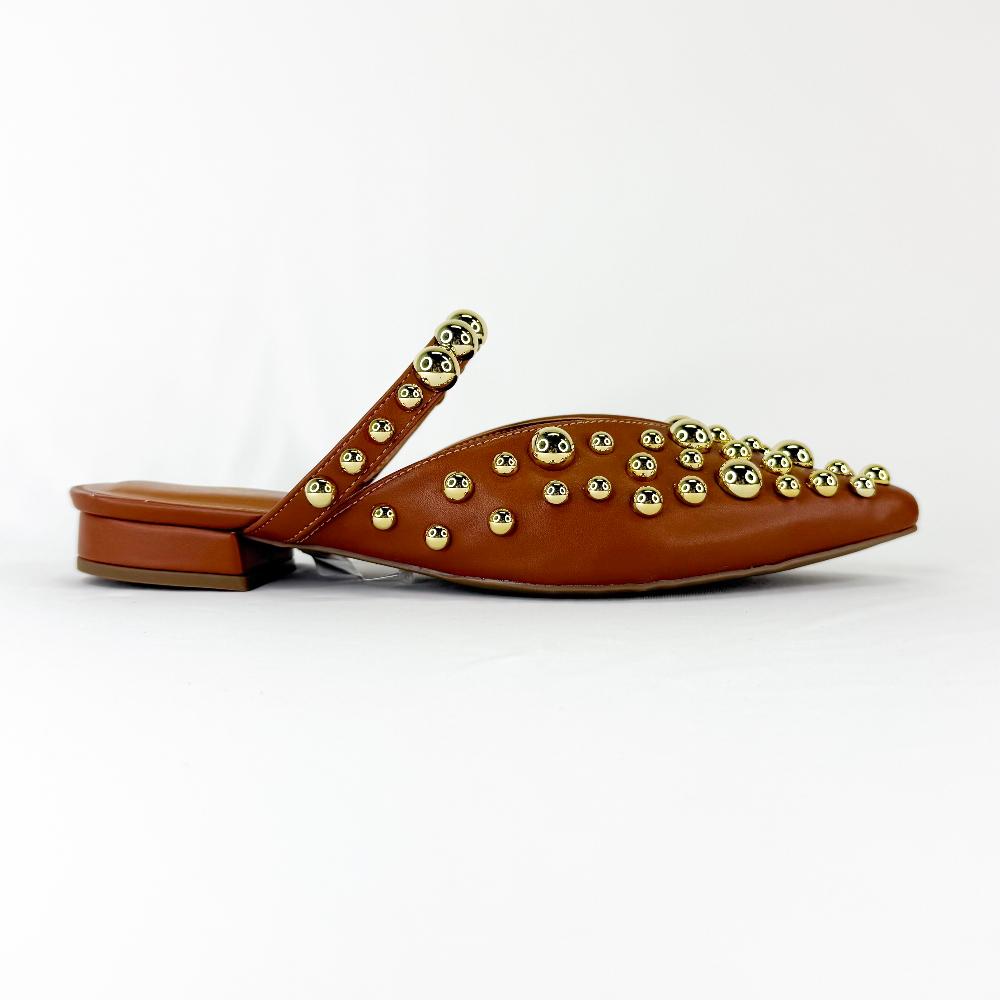 A Mule Manu é puro charme e elegância! Com uma tira elegante sobre o pé e é adornado com esferas metalizadas na cor dourado, que conferem um brilho luxuoso e sofisticado ao design. Sem tira no calcanhar, ele oferece um estilo moderno e confortável, ideal para ocasiões especiais ou uso diário com um toque de glamour.