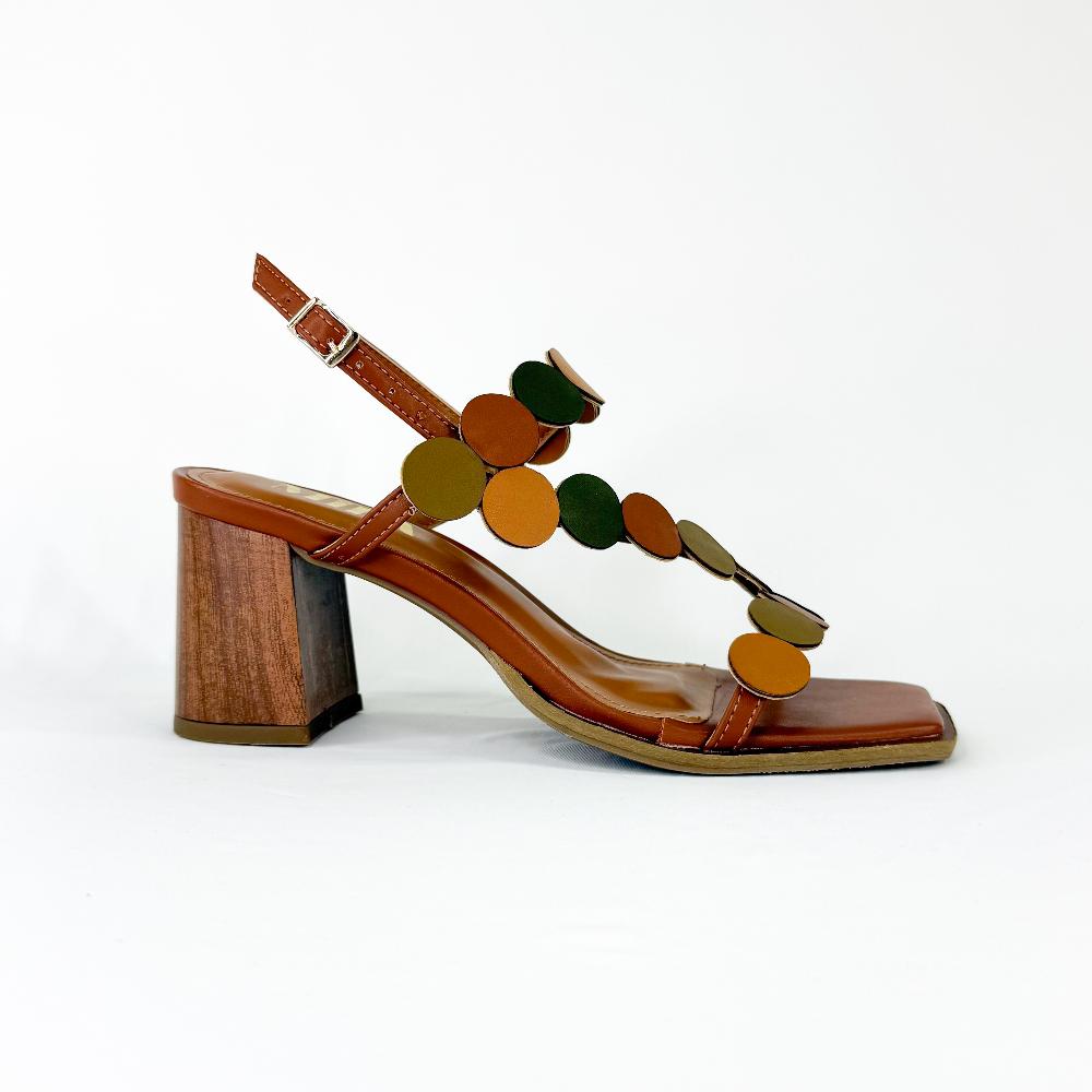 Esta sandália apresenta um bico quadrado moderno e um salto bloco amadeirado, conferindo um toque rústico-chic ao design. Detalhes de círculos na transversal em tons terrosos adicionam um visual sofisticado e natural. Com fechamento no tornozelo em fivela, ela oferece um ajuste seguro e confortável, tornando-a perfeita para ocasiões casuais ou mais formais com um estilo único.