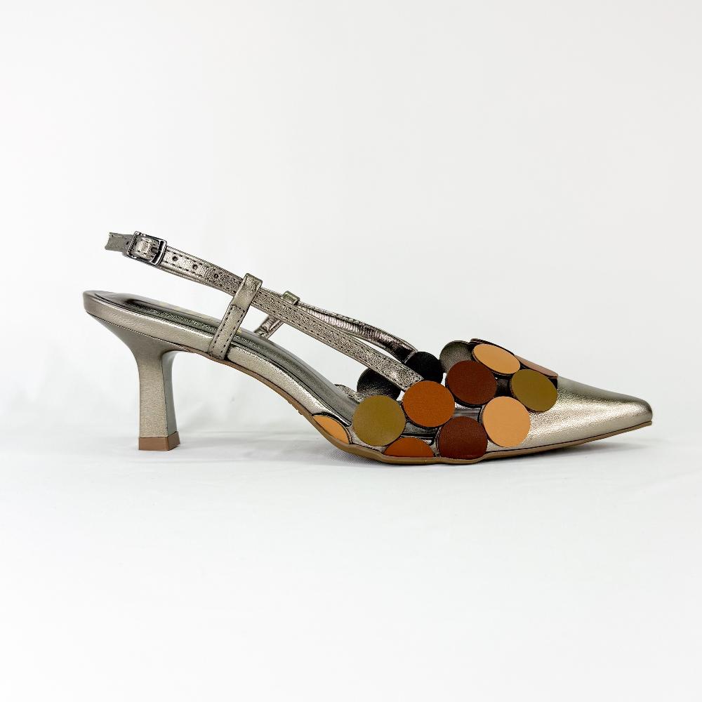 Nosso scarpin tem aplicações de círculos em uma paleta de tons terrosos, criando um visual único e sofisticado. Com fechamento no tornozelo em fivela que permite regulagem, ele oferece um ajuste confortável e seguro, tornando-o perfeito para ocasiões especiais ou uso diário com um toque de elegância natural.